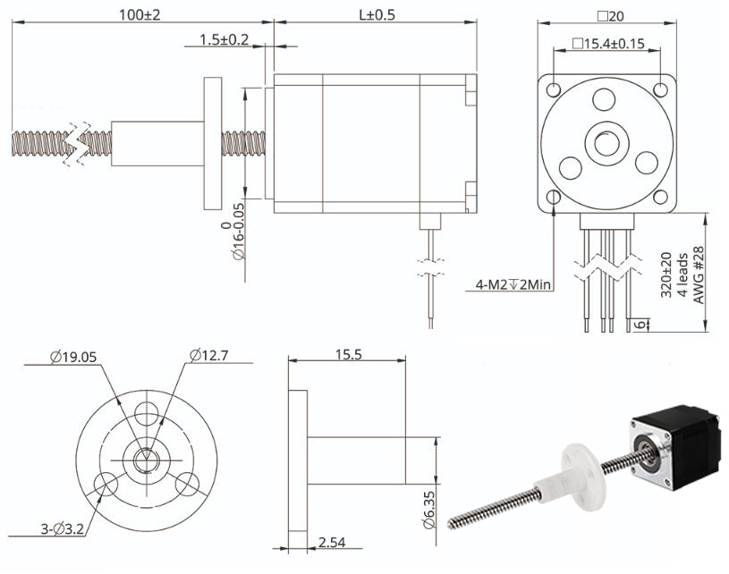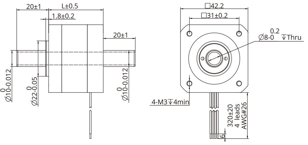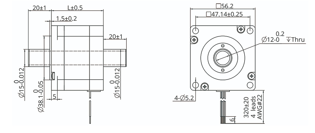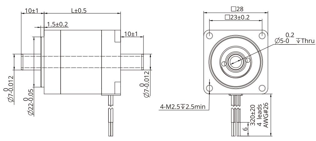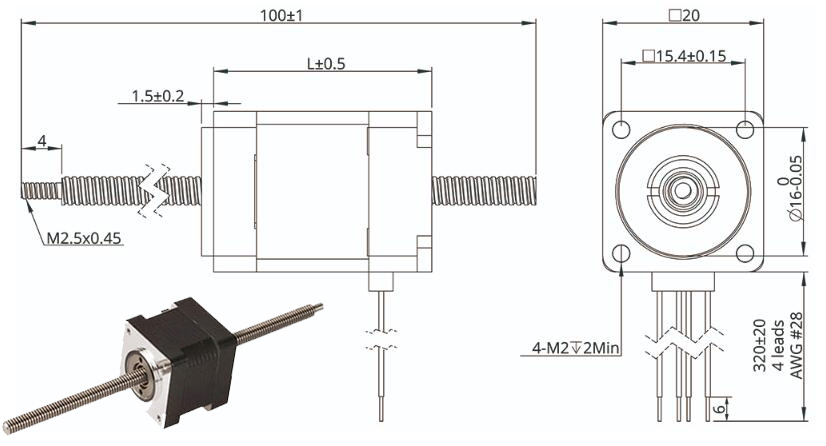 Motor Size | Voltage/ Phase (V) | Current/ Phase (A) | Resistance/ Phase (Ω) | Inductance/ Phase (mH) | Number of Lead Wires | Rotor Inertia (g.cm2) | Motor Weight (g) | Motor Length L (mm) |
